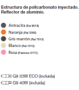 Fabricada en policarbonato inyectado se encuentra disponible en los siguientes nuevos colores: naranja, blanco perla, rosa, marrón y antracita. El interruptor está integrado en la base de la lámpara.