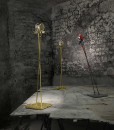 Corian, cristal, espejo de aluminio. El movimiento del agua es ajustable, como la velocidad y los intervalos de la rotación son ajustables electrónicamente.