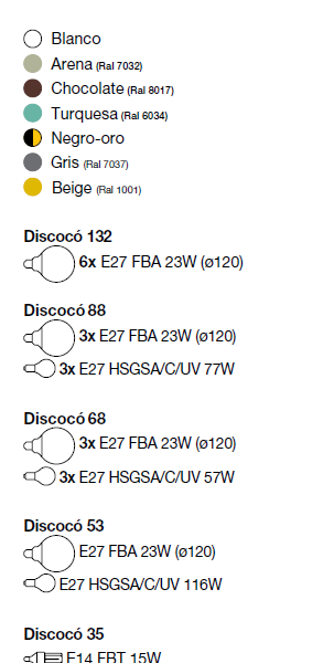 Su detallado estudio de la luz incidente y rebotada en ambas caras de los 35 discos que la componen, da una atractiva graduación de matices lumínicos y profundidad a la pieza. La esfera cromada del núcleo, donde se anclan los discos, aporta reflejos suplementarios. Apagada la lámpara preserva su atractiva presencia, sugiriendo esa expansión de energía que cobra todo el sentido al utilizarla.