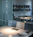 FLEX es una lámpara de sobremesa totalmente orientable para facilitar la lectura. Diseñada por Ramos & Bassols. Está disponible en dos colores a elegir: lacado blanco y grafito mate.