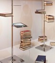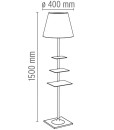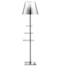 Dispositivo de iluminación de pie con luz difusa. Base, soporte de varilla y soporte de difusor en zamak fundido a presión y cromado. Cobertura de la base en chapa de acero P04 galvanizado. Difusor interno y soporte porta-bombilla de PC moldeado por inyección y de color traslúcido. Los difusores externos están disponibles en tejido laminado de PVC, bien en metacrilato moldeado por inyección con acabado transparente o en gris ahumado, o en metalizado plata o bronce en la superficie interior utilizando un proceso de aluminizado en vacío. Anillo superior de PC moldeado por inyección transparente. Repisa de acero inoxidable brillante. La entrada de USB sobre la base permite recargar los smartphones y tablets más utilizados (Máx. 2A). |