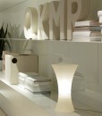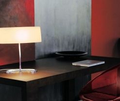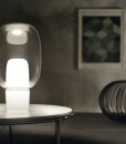 La lámpara de sobremesa Yoko es una delicada burbuja de jabón, que tiembla en el espacio, llenándolo con una nórdica luz blanca: esta es la imagen que inmediatamente viene a la mente con YOKO. La base, que encierra y esconde la fuente luminosa, está formada por dos vasos en policarbonato translúcido opalino, moldeados por inyección. La “burbuja” superior en PMMA se obtiene mediante un proceso de inyección-soplado, técnica muy similar a la elaboración del vidrio soplado.