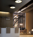 El tono de desenfado del nombre es un reclamo que subraya su intención de ofrecer una alternativa a este tipo de luminaria. Es un plafón que busca su atractivo en la simplicidad y nitidez, pero también en el efecto de luz múltiple, alcanzado gracias a su diseño. La estructura que orbita alrededor del difusor, de vidrio soplado blanco, queda ligeramente despegada del techo y filtra la luz hacia arriba generando un halo luminoso. Ese mismo aro de aluminio, también blanco en su interior, actúa como reflector y crea un nuevo halo que circunda la pantalla con luz directa. Disponible en tres diámetros, puede utilizarse además como aplique de pared.