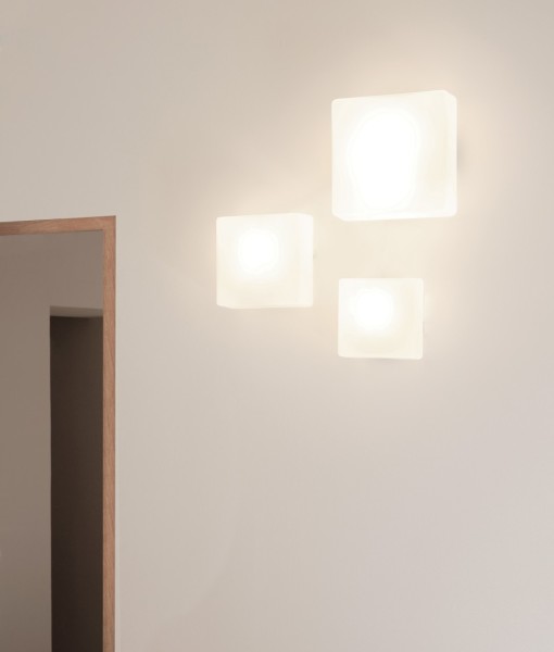 Lámpara del techo, con difusor en cristal soplado opalino y la base en metal blanco con recubrimiento epóxico. Nueva versión disponible para Ø25/30cm LED.
