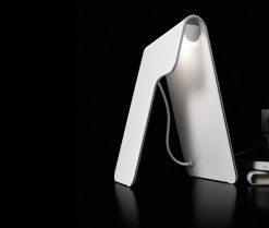Luminaria de mesa halógena fabricada en aluminio pulido brillante. También pantalla de vidrio blanco o azul.